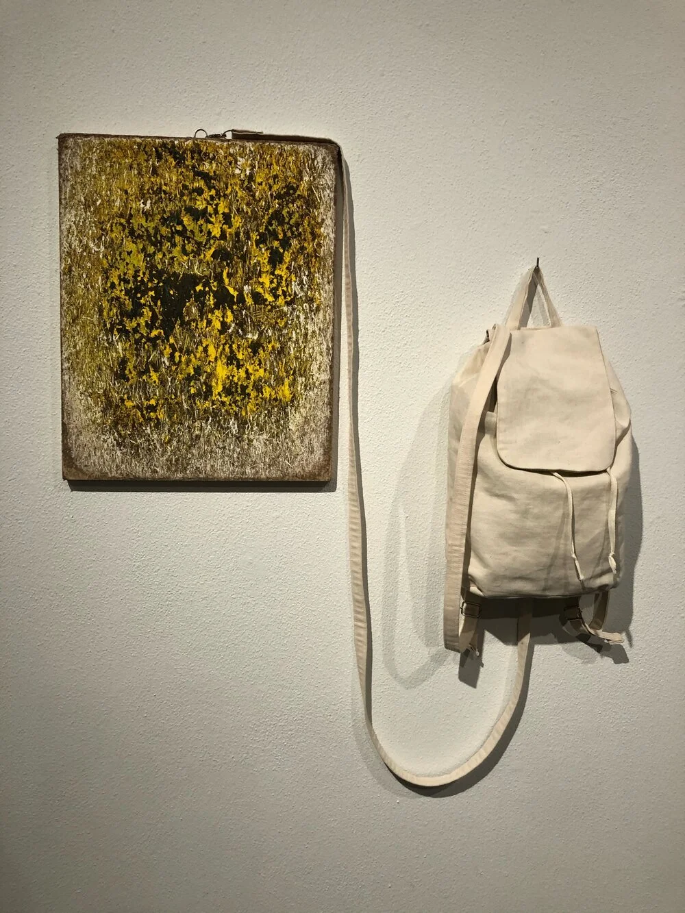 There are works by Seattle artist Margie Livingston, whose most recent solo show, Circumambulation, opened last year in Tasmania. She has developed harnesses with which to drag paintings behind her on walks through local terrain, a process she calls Extreme Landscape Painting. Livingstons’s earlier works began as white panels, building up marks as the paintings scraped the Earth. Lately, however, the panels begin as layers of paint, allowing the ground to reveal colors through gouging and dragging. “Positioning the painting in intimate contact with the ground, turning its face away from the human viewer/maker,” write Cara Tomlinson and Tia Factor in the exhibition essay, “creates a conversation with the earth— one that questions one-point perspective and the promise of escape in landscape painting.” Through this work, Livingston has found a way to begin decolonizing the practice of painting.